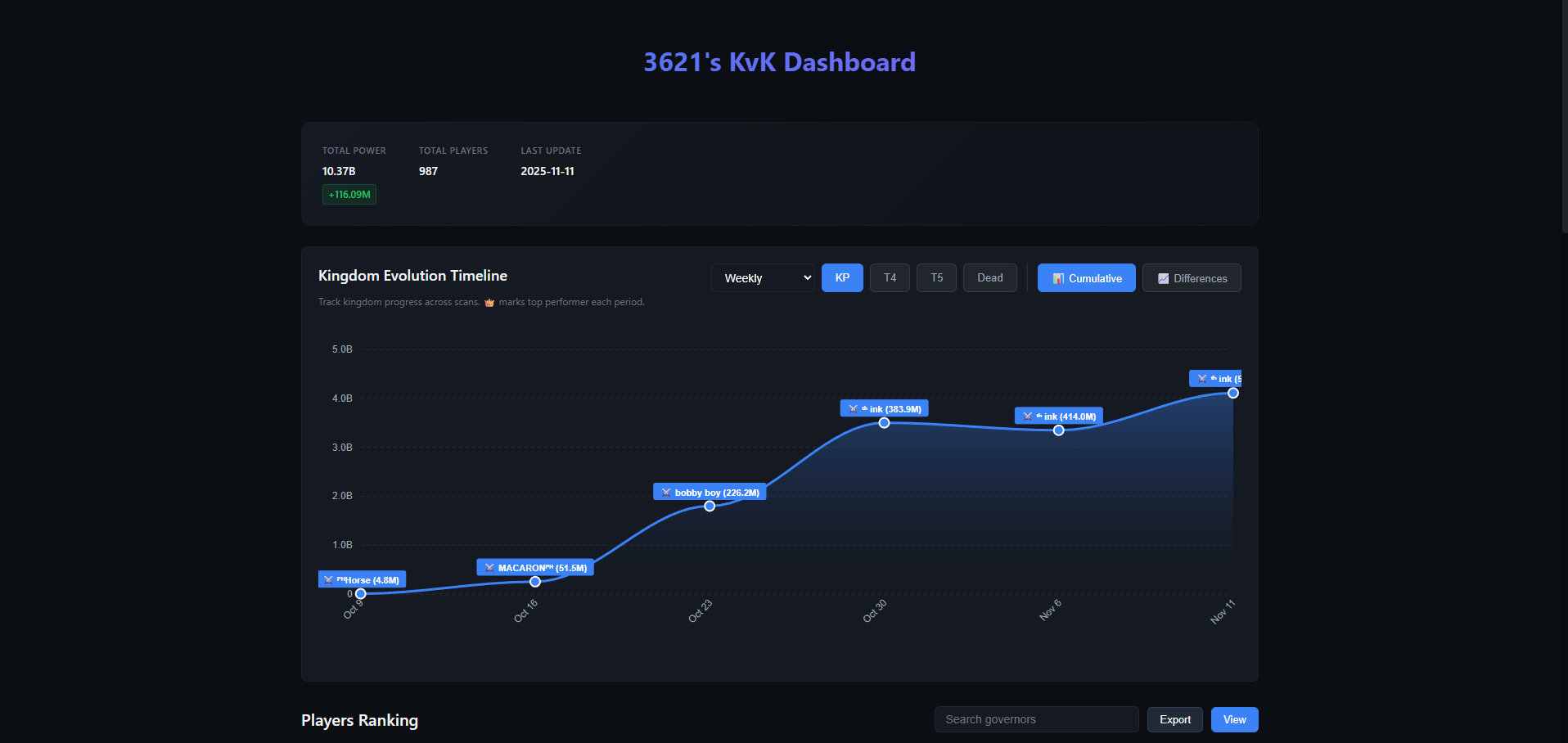 Track kingdom progress across scans. 👑 marks top performer each period.